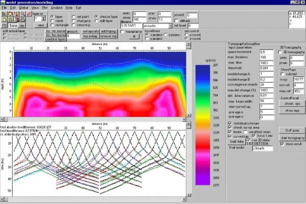 Para los especialistas en prospección profunda, las herramientas de refracción y perforación (borehole) de REFLEXW son excepcionales. El software transforma los datos crudos en perfiles geológicos detallados utilizando métodos de inversión de frente de onda y tomografía computarizada (SIRT) para crear mapas precisos de velocidad del subsuelo. Incluso permite validar estos modelos empíricos simulando la propagación de ondas a través del terreno (modelado Forward FD) para comprobar que la teoría coincide perfectamente con la realidad medida.
